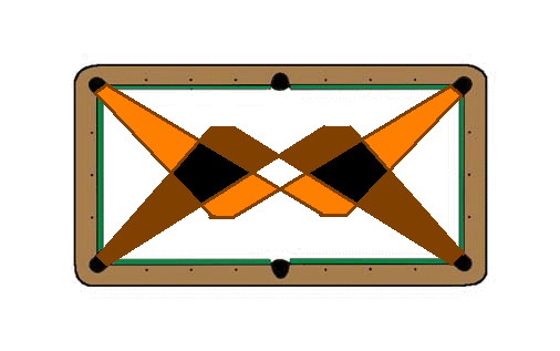 ちなみにこの範囲は人によって若干変わります。というのも例えば上のサイドにねらうと、手玉は下にくるわけですが、あまりに下にある的球は手玉をつくのにキューをたてなければならないのです。なのでここではキューをたてなくていい範囲にしてます。図1に関しても同じです。タテキューの上手い人はもっと範囲が広がるのです。